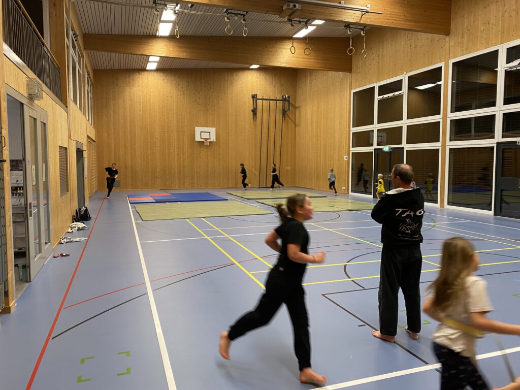 Durch die grosse Turnhalle, das Holz und viel Licht entsteht eine freundliche und Raumatmosphäre und ein sehr angenehmes Trainingsumfeld.